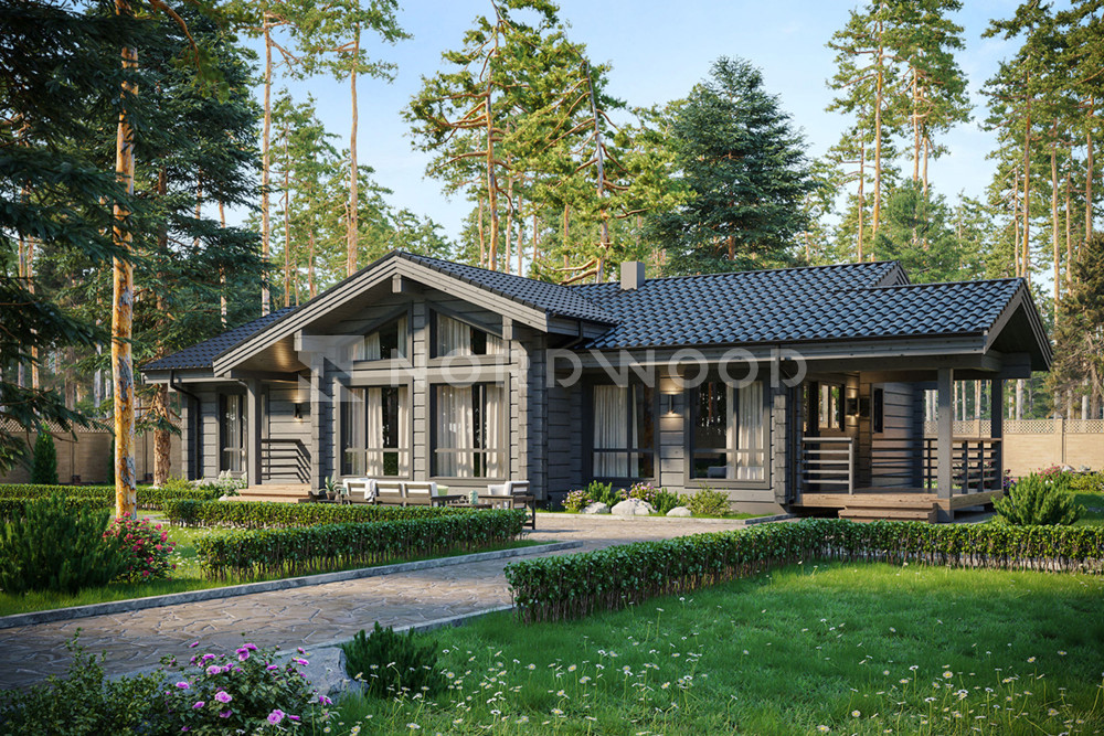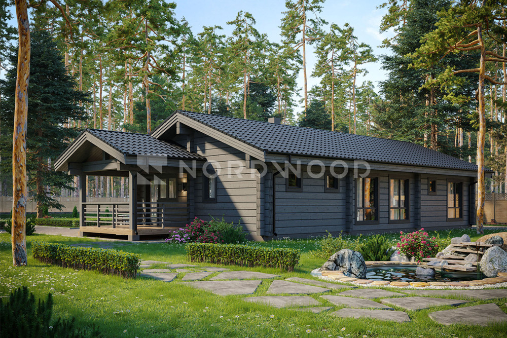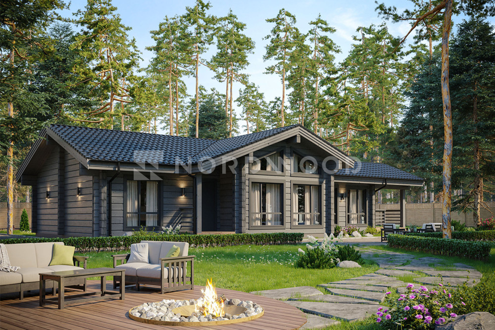 В планировку одноэтажного загородного коттеджа в скандинавском стиле площадью 139 м2 входит мастер-спальня с отдельной гардеробной комнатой и ванной, две детских, большая гостиная, европейская кухня-столовая, прачечная, котельная.