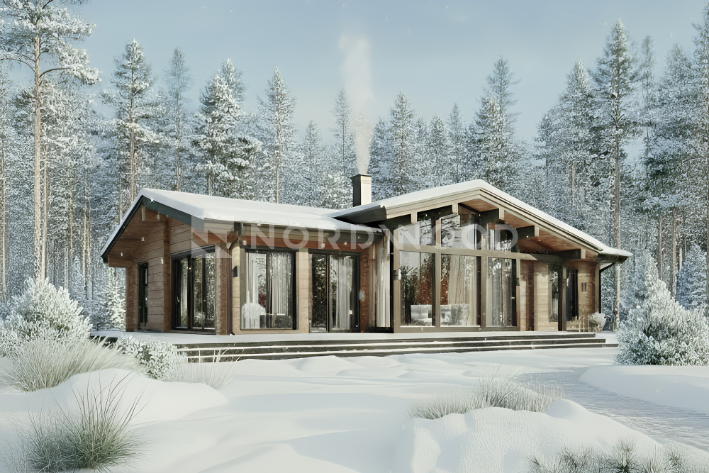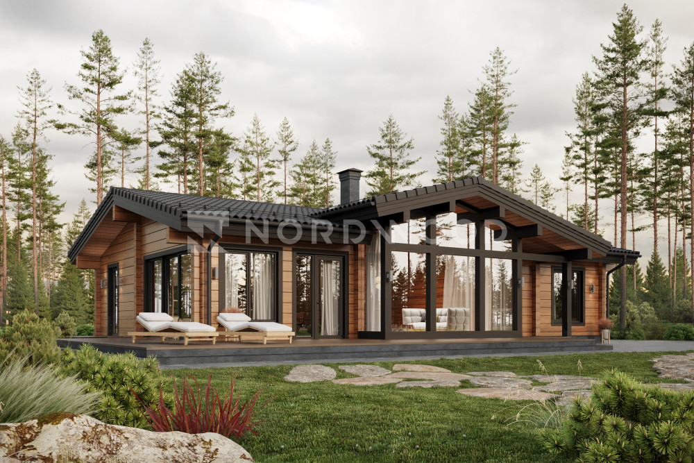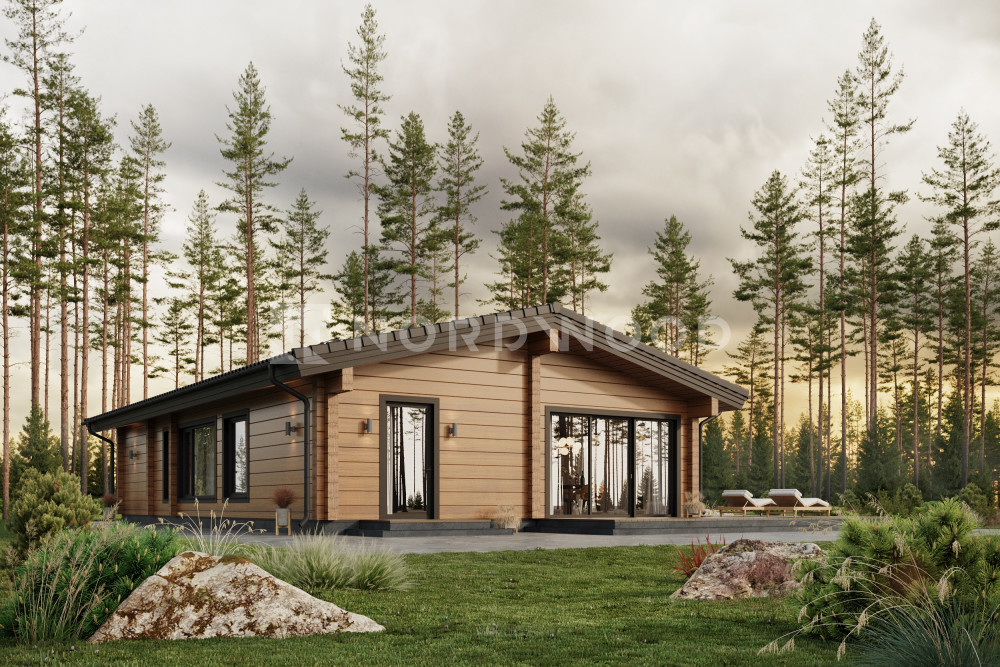 Проект одноэтажного дома из клееного бруса NORD-150 — это уют и рациональность. Все жилое пространство для семьи расположено на уровне, без лестниц, что особенно оценит каждый, кто думает о долгосрочном комфорте и безопасности. Большие окна и открытая планировка дарят ощущение простора, наполняя интерьер естественным светом.