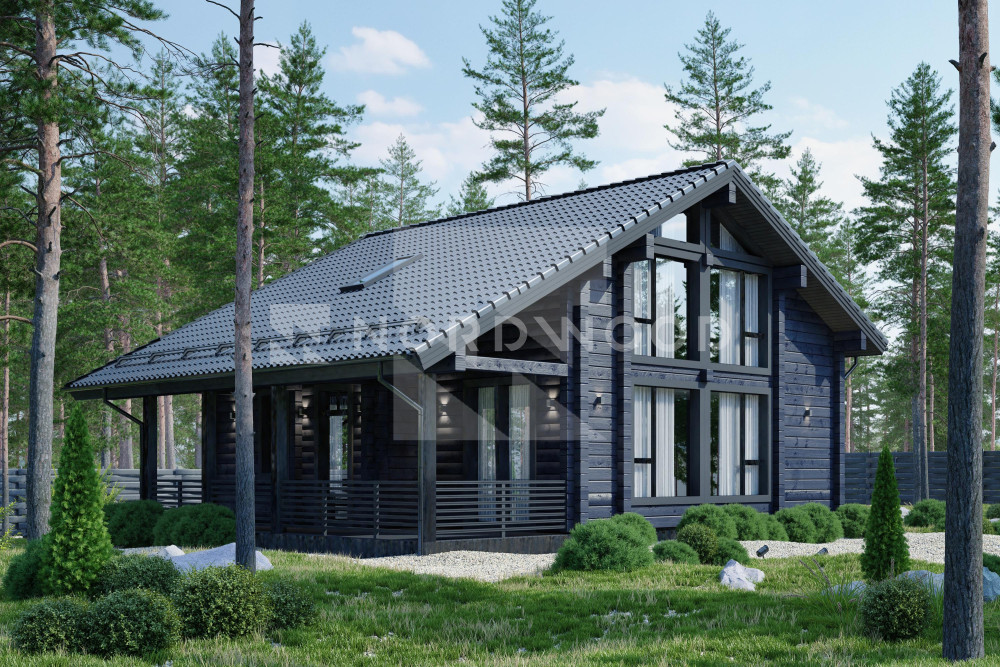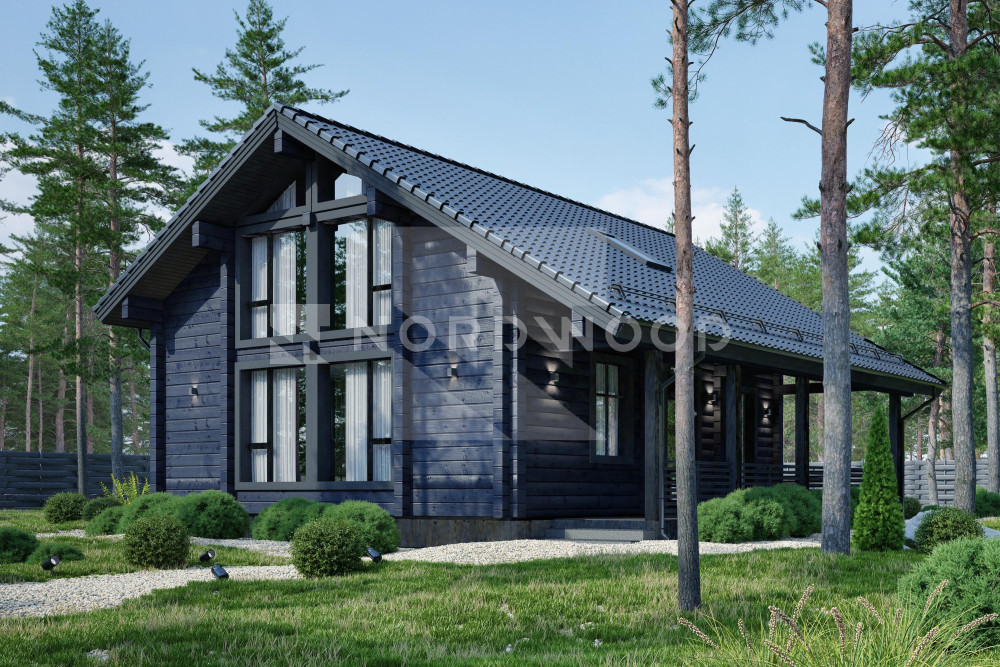 Теплый деревянный дом высотой в два этажа с панорамными окнами «в пол» и большой террасой — отличное решение для комфортного проживания за городом. В доме четыре спальни, одна из которых расположена на первом этаже, два санузла — по одному на этаж, уютная кухня-гостиная, отдельное помещение под котельную. Деревянный коттедж с двускатной крышей в стиле шале прекрасно впишется в ландшафт любого загородного участка.