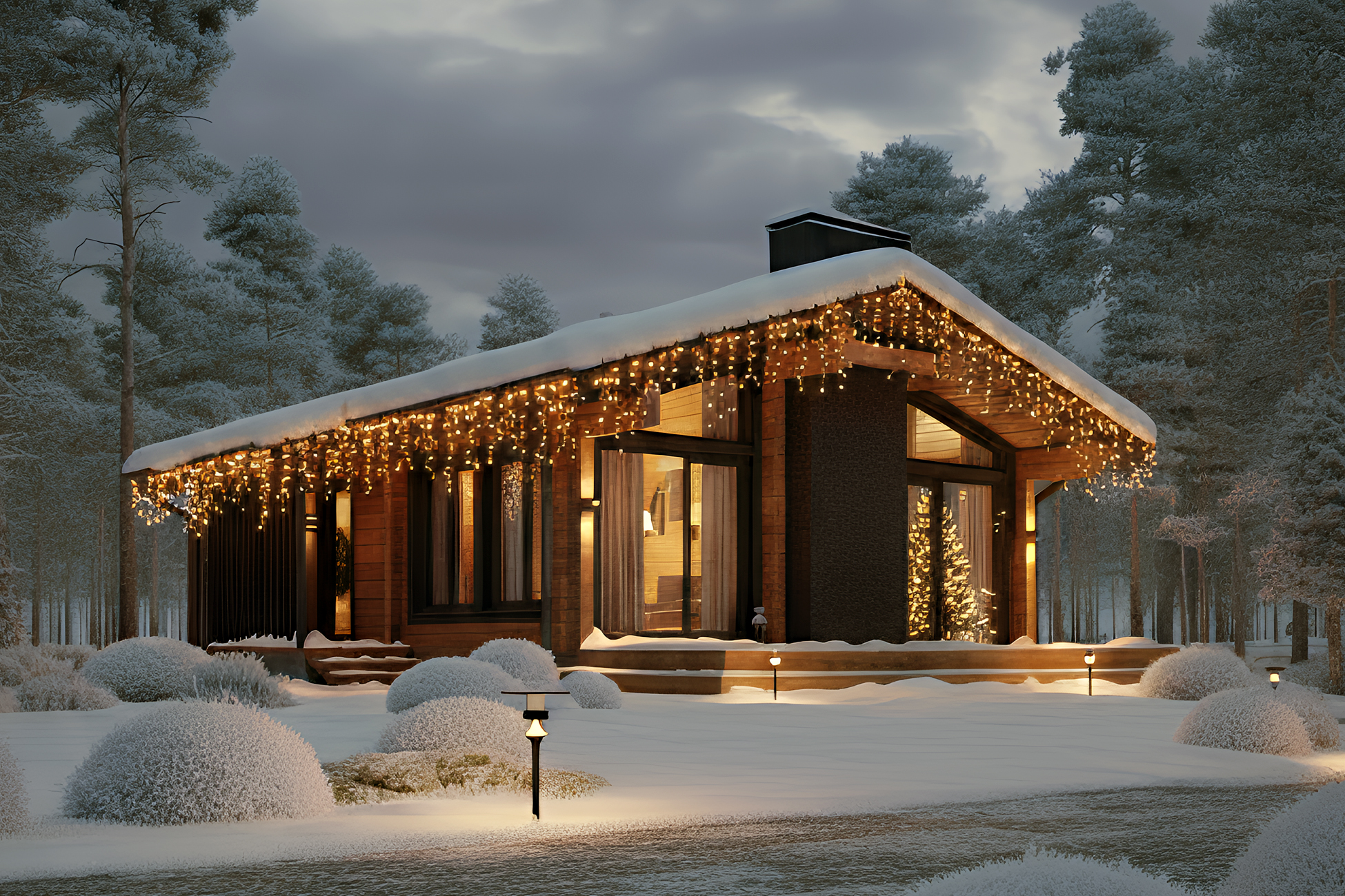из профбруса и бревна до 100 м — идеальный выбор для застройки загородного участка. Это коттедж в стиле шале с двумя спальнями, отдельными помещениями по прачечную и котельную. Широкие свесы крыши защищают большую террасу от косого дождя и снега, панорамные окна в пол обеспечивают хорошую освещенность гостиной и кухни-столовой. У камина в уютной гостиной можно быстро согреться морозными зимними вечерами.